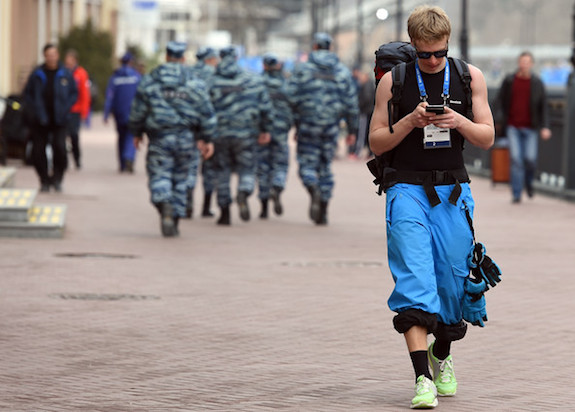 The warm weather and the serious military presence in Sochi are both on display in this photo. Though a week has gone by without incident, the threat of a terrorist attack remains a very real concern at the Olympics. Image via Zimbio/Lars Baron/Getty