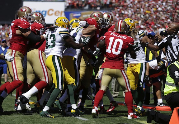 Hopefully the ill-advised hit was cathartic for Matthews, because it certainly didn’t do his team any good. Kaepernick was brought down after a four-yard gain on Green Bay’s 10-yard line. The dirty play sparked a brief brawl on the sideline, which actually cost San Francisco because left tackle Joe Staley’s penalty offset the initial infraction by Matthews.