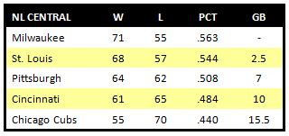 Right now, the Pirates are two games back of Atlanta and San Francisco for the second spot, and 4 1/2 back of St. Louis for the primary berth.