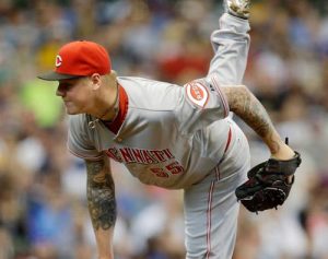 Mat Latos showed little rust in his first start of the season, pitching six shutout innings for the Reds at Miller Park.